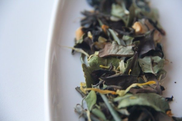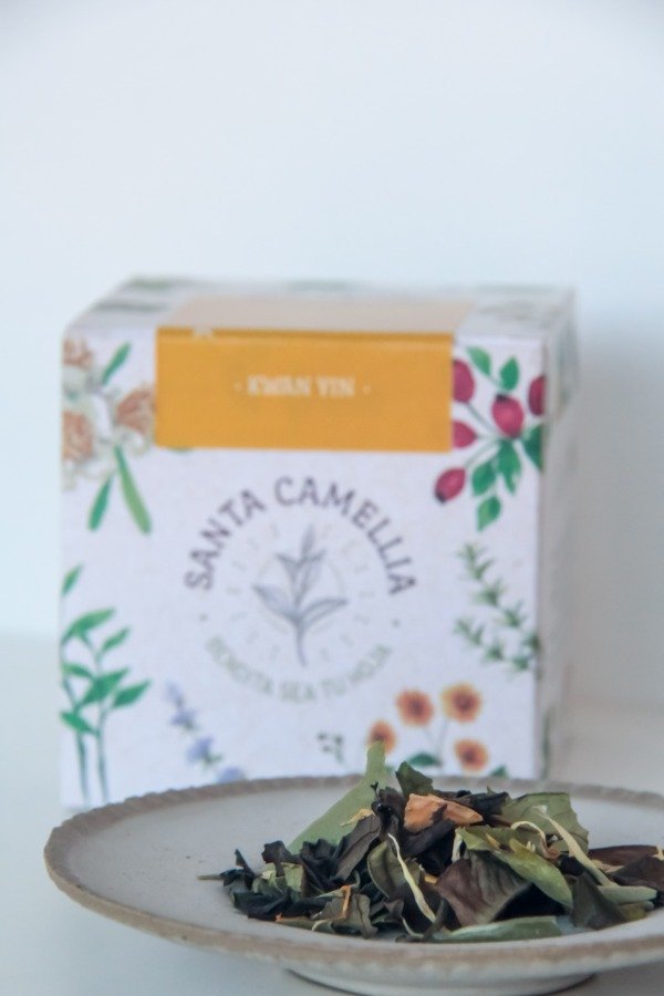 Blend con Base de Té Blanco (Misiones, Arg,), Hojas de Olivo, trocitos de Manzanas orgánicas, Cascarilla de Rosa Mosqueta, Pétalos de Caléndula.
